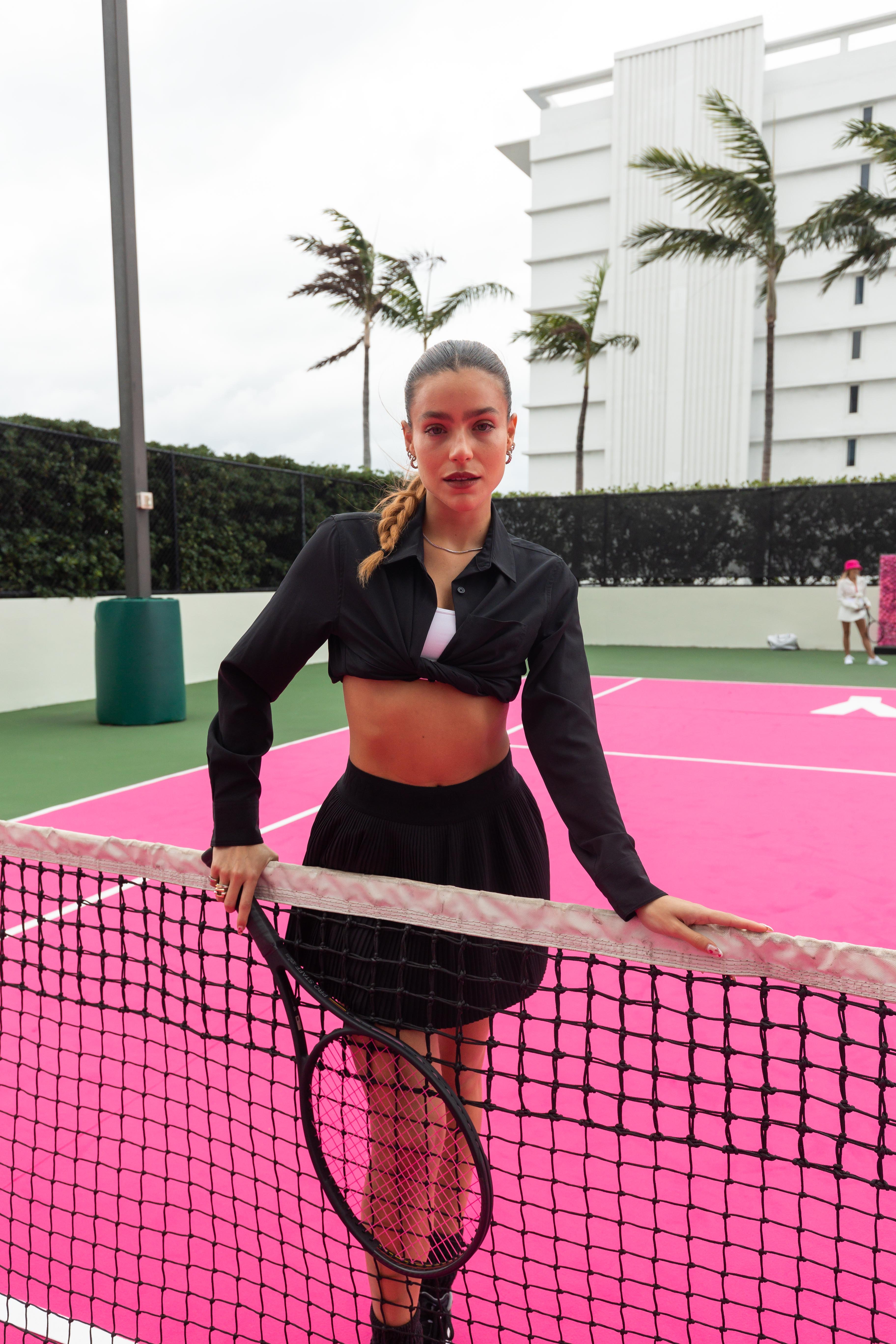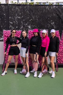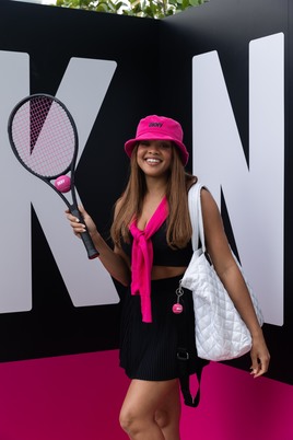 Starting the day, content creators Alicia Pettitt, Chanel Iman, Isabela Grutman, Jasmine Sanders, Martha Graeff, Michelle Salas, Tamia Everett, and Valeria Lipovetsky, rallied alongside Miami tastemakers for personalized tennis clinics, swinging rackets against famed Olympic gold medalist and renowned tennis athlete, Monica Puig. DKNY’s captivating pink invaded the rooftop of the W Hotel, enveloping guests in a playful and immersive tennis experience. The space showcased a custom branded lounge and ‘beetroot’ pink tennis court, nodding to the collection’s signature hue.