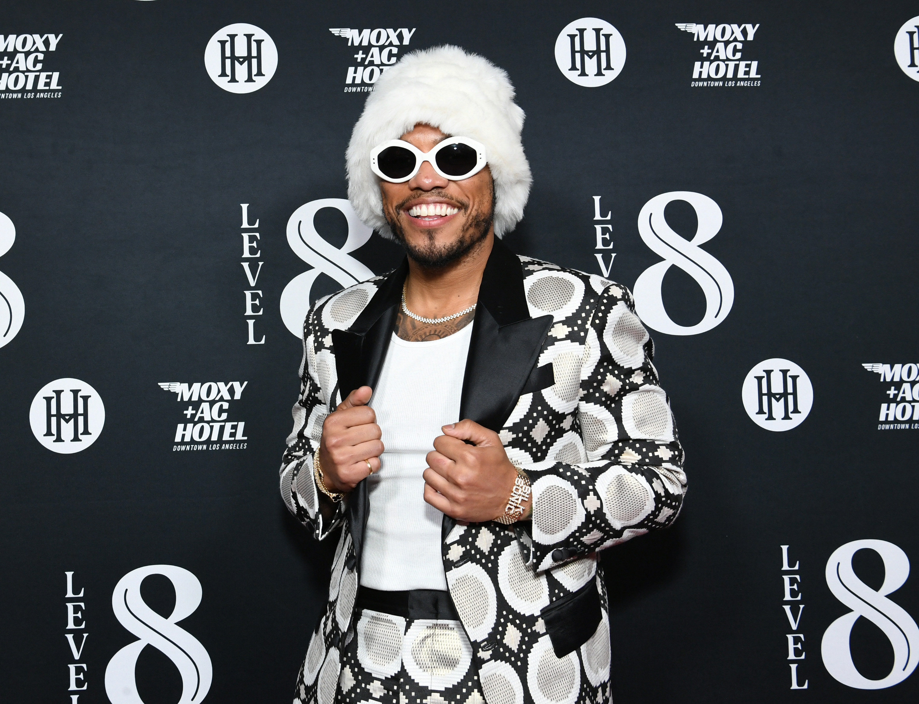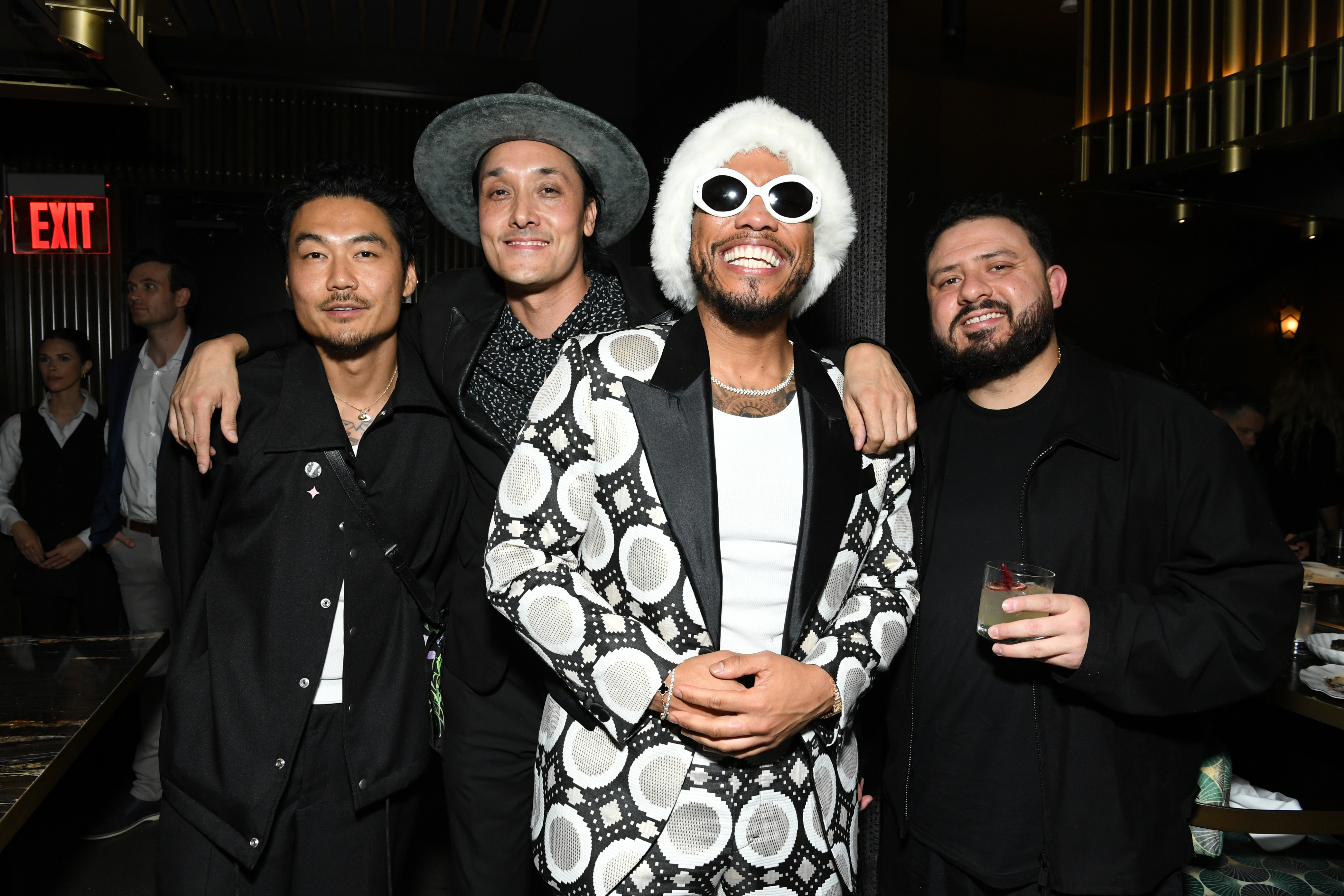 Guests were greeted with an immersive 3D projection-mapped installation and took elevators up to the eighth floor of Moxy & AC Hotel Downtown LA. At piano bar and jazz lounge Mr. Wanderlust, guests were served champagne by an aerial dancer who spun from a grand chandelier. The night began with a privately held dinner at Maison Kasai, where guests were stunned by a theatrical teppanyaki service by Chef Josh Gil, attended by close friends musician Anderson Paak, actors Jeremy Renner and Aaron Paul. Through a hidden library bookshelf at Mr. Wanderlust, guests saw the bar’s wall spin open to reveal live entertainers, from feather-cladded dancers to a pianist. The star-studded evening surprised partygoers at every turn, from fire dancers on the pool deck at Golden Hour to a lucha libre performance at Sinners y Santos.