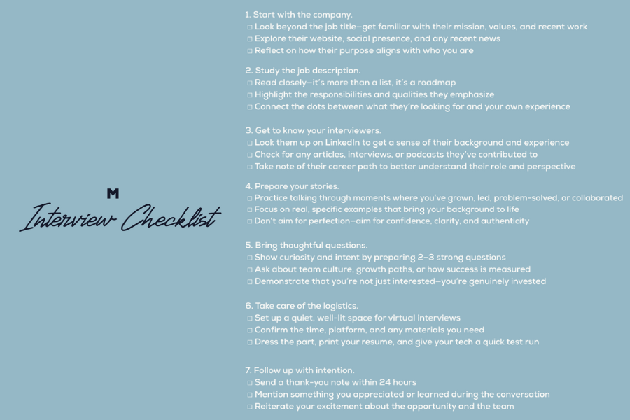 Interview preparation is as much about perspective as it is practice. In this article, Carly Mednick, chief operating officer and founder of Monday Talent, outlines a thoughtful, grounded approach to showing up with confidence—from understanding a company’s purpose to articulating your own story—offering practical guidance for navigating interviews with clarity and intention.